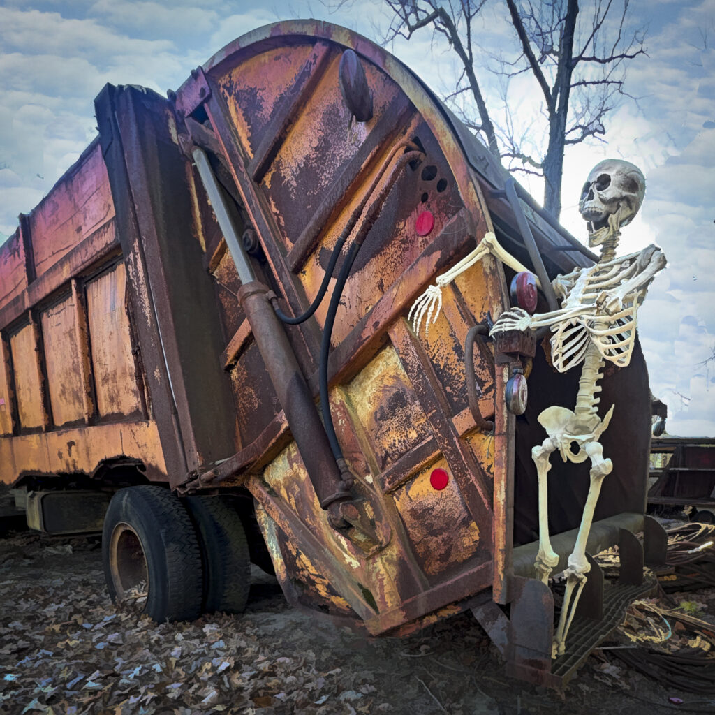 While Jim was setting up this shot, the neighbors kept driving up the driveway behind Betsy, and she would run and hide in the garage until they passed.Betsy’s turn to make Jim dress up to take out the garbage. The silk top hat is a real vintage hat that belonged to Betsy’s great uncle.